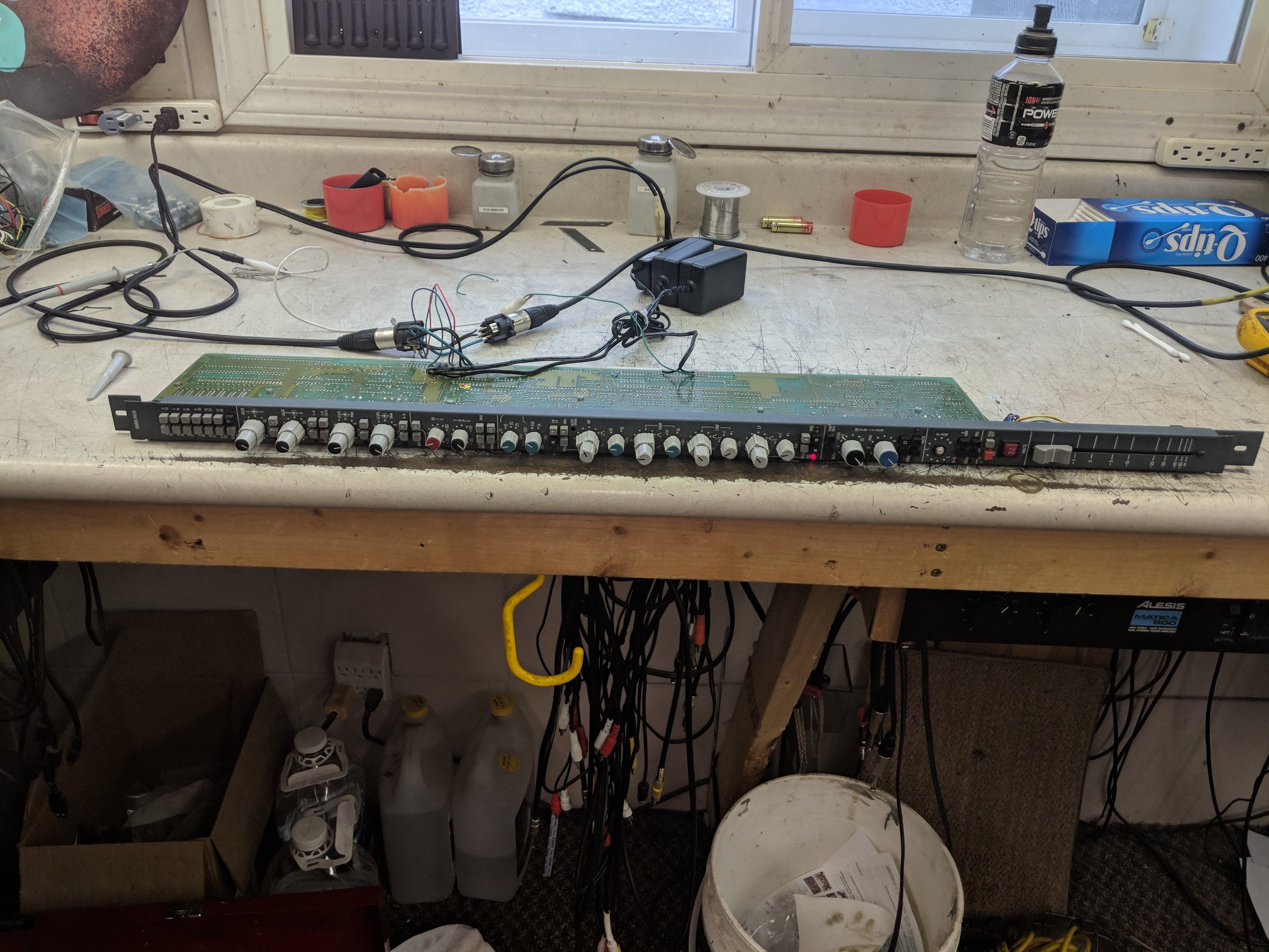 This is an AMEK HX10 strip. I am told it is a Rupert Neve design. I was told to figure out how to make it work as a standalone strip. I have just finished doing that. I thought it would take me two and a half days to figure this all ou, but I was wrong. So far, I have spent 8 hours on this and I got 90% of everything we need working. The power supplys in the back ground are cheap switching PSUs that have enough jam to easily drive 2 strips and in theory they could drive 4 strips. And you should hear the EQs on this thing...A very effective parametric EQ from Rupert Neve! The hardest part was figuring out why sometimes the switching logic worked and sometimes it did not work. Turns out there was a pin on the CPU that was not being pulled Hi or Low; just hanging there in lala Land. This was the Power Fault pin. So sometimes it would think, "I am in power fault mode" and some times not. It had a mind of its own. I pulled this pin high with a 10K resistor and hence no more indecision. From here on we have to design an enclosure and possibly adding phantom power.