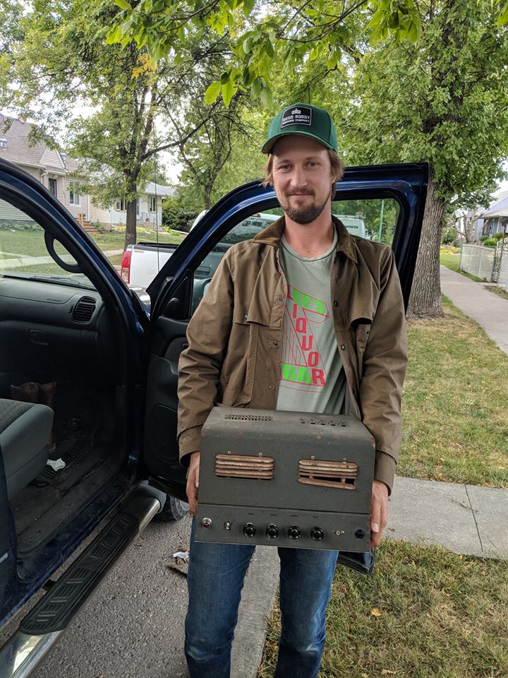 Here is Winnipeg musician Del Barber posing with his POS-3. I spent a lifetime (almost!) getting all the bugs out of this baby. When done, it put out about 45W RMS and has 3 speaker impedances. I also gave it a Master Volume and Gain control.