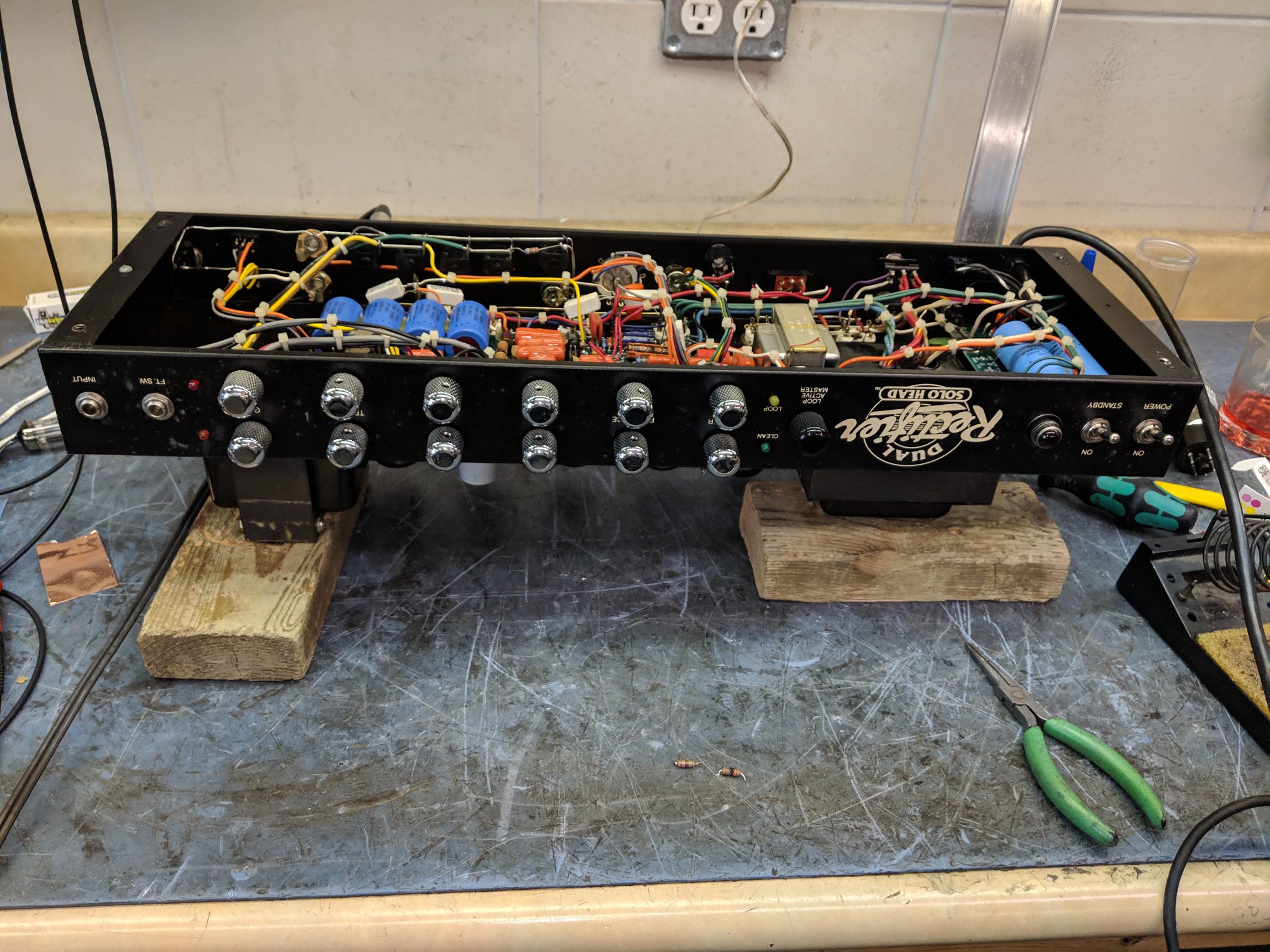 I found one bad preamp, two bad rectifier tubes, and noisy effects loop insert jacks. After I repaired and replaced all that, I tested it. The amp hummed in a strange way. I traced the hum back to the input on V2. I tried and tried to eliminate the hum, and could not do it. I consulted with the folks at Mesa Boogie and they suggested that maybe I was expecting too much from this amp. This was a reasonable suggestion; all high gain amps have some hum in them.