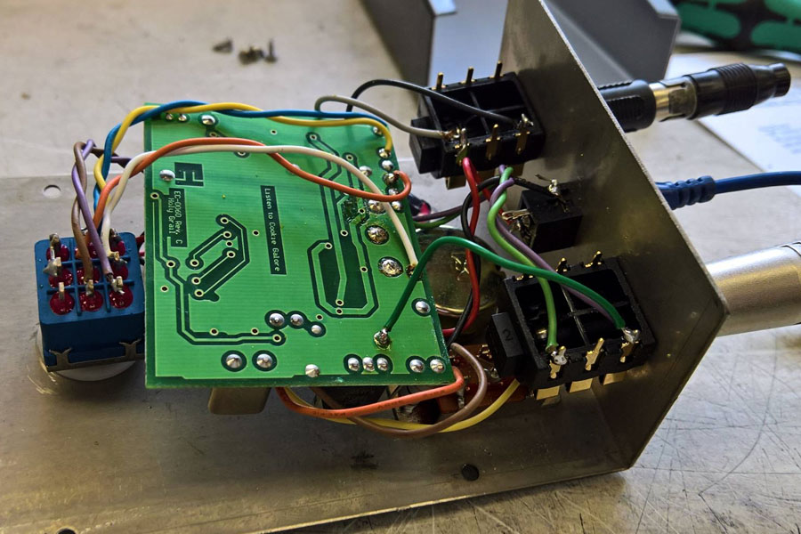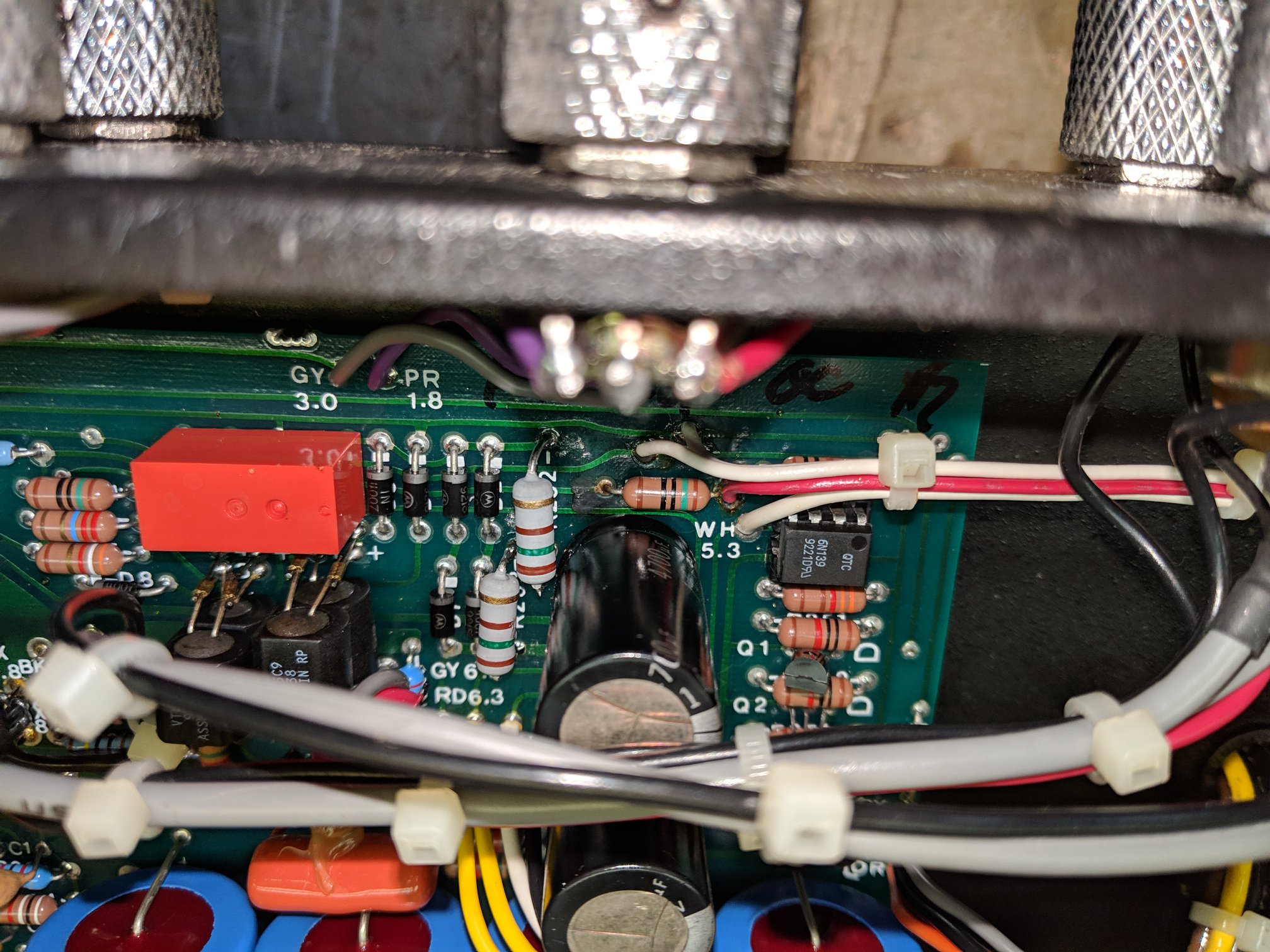 Except, of course, this one. Why is this one different? An original Holy Grail comes with all metal input/output jacks. As you can see, I have replaced those jacks with plastic Neutrik jacks. Now, why would I do that? Metal jacks make a ground connection to the chassis. Hence, we have 3 ground connections to the chassis: the input jack, the output jack and the power jack. This creates "ground loops." By using plastic jacks, I eliminated the ground loops. After that, I had to add a ground jumper from the output jack to the chassis ground. But not all ground points are the same! Grounding at the output jack nut or the AC ground created noise. So I added the green wire and grounded at the voltage regulator on the PCB, as you can see in the picture below: